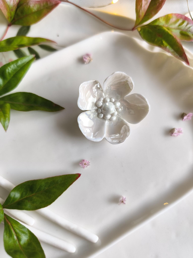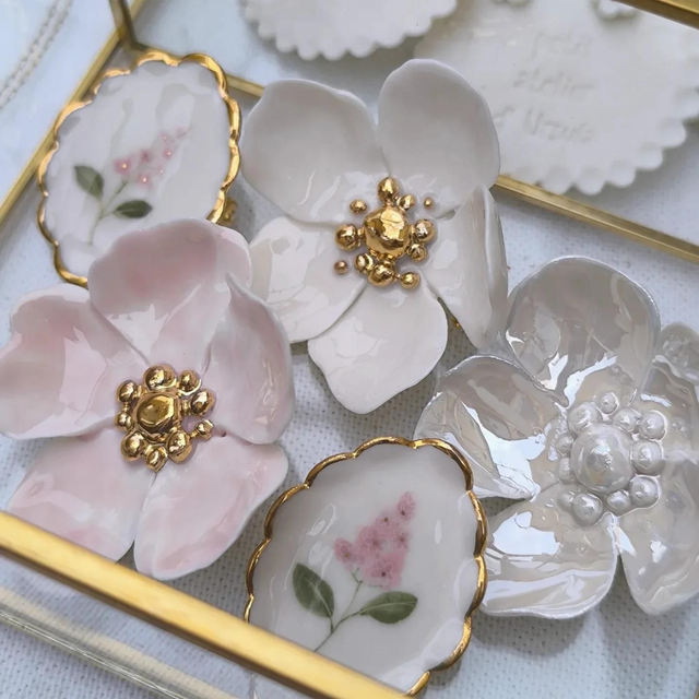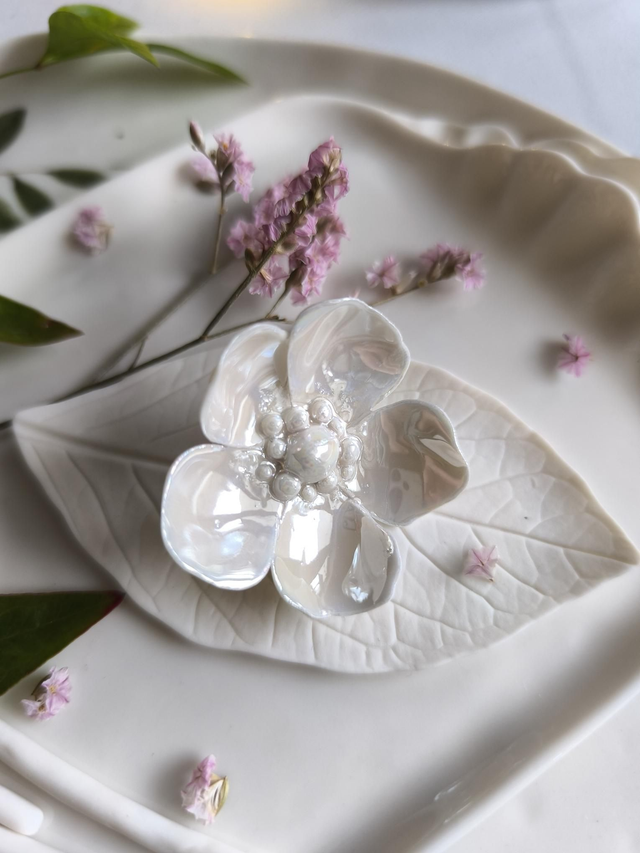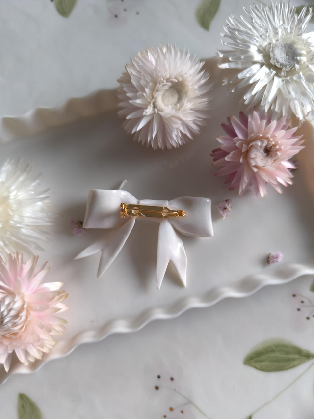 These exquisite brooches are hand-sculpted from translucent porcelain and decorated with gold or pearl lustre. Each petal and ribbon is hand-sculpted using only my hands.