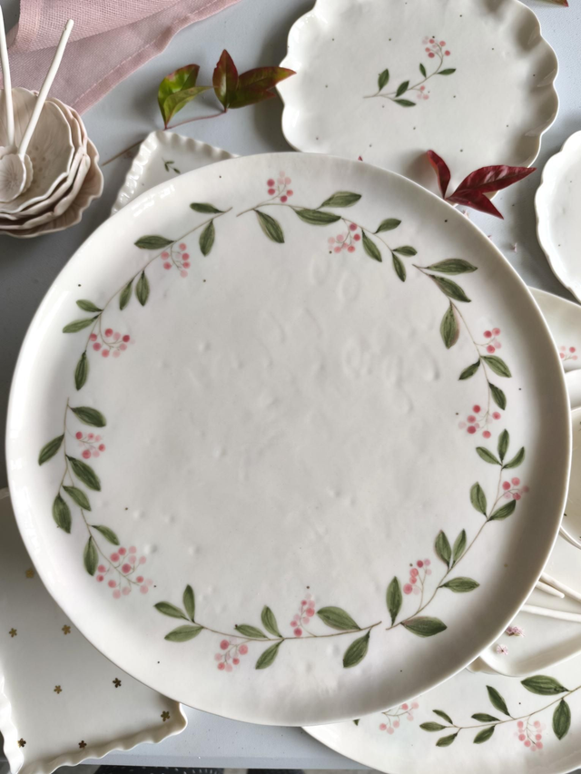 Beautiful plates with winter berries are formed by hand from thin slabs of translucent English porcelain and hand-painted with underglazes. They are coated with clear glaze and decorated with gold lustre. Although they look thin and fragile, they are strong due to the hi-fire process which makes porcelain hard and resistant to be enjoyed every day.